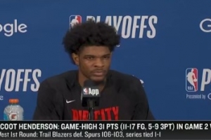 24直播网4月22日讯 西部首轮系列赛G2,开拓者106-103力克马刺大比分1-1平。赛后亨德森接受了采访,以下为采访全文。