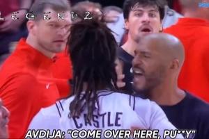 卡斯尔面对阿夫迪亚上篮2+1后,将球直接按到了阿夫迪亚胸口。