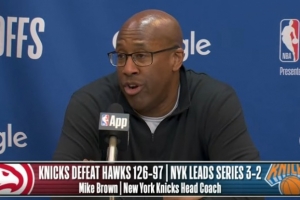 24直播网4月29日讯 NBA季后赛首轮G5,尼克斯126-97轻取老鹰,大比分3-2领先,迈克·布朗赛后接受了媒体采访,以下为采访全文。