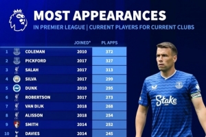 24直播网4月29日讯 德国转会市场统计现役球员当前俱乐部的英超出场次数,并列出榜单,科尔曼、皮克福德、萨拉赫前三。