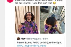 24直播网04月22日讯 切尔西客战布莱顿,帕尔默和若昂·佩德罗伤缺,这一消息遭库库雷利亚理发师提前泄露。
