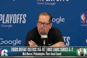 24直播网4月29日讯 首轮系列赛G5,76人客场力克凯尔特人,将大比分追至2-3,76人主帅尼克·纳斯赛后接受了媒体采访,以下为完整采访内容。