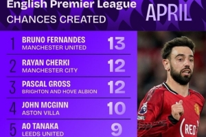 24直播网4月30日讯 数据机构squawka统计了英超4月创造机会情况,B费力压谢尔基居首。